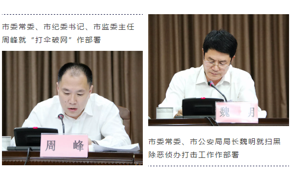 市委副书记、政法委书记徐张艳讲话。周峰、魏明分别就“打伞破网”和侦办打击工作作了部署。会上,市委组织部相关负责人就加强基层组织建设作了交流发言。